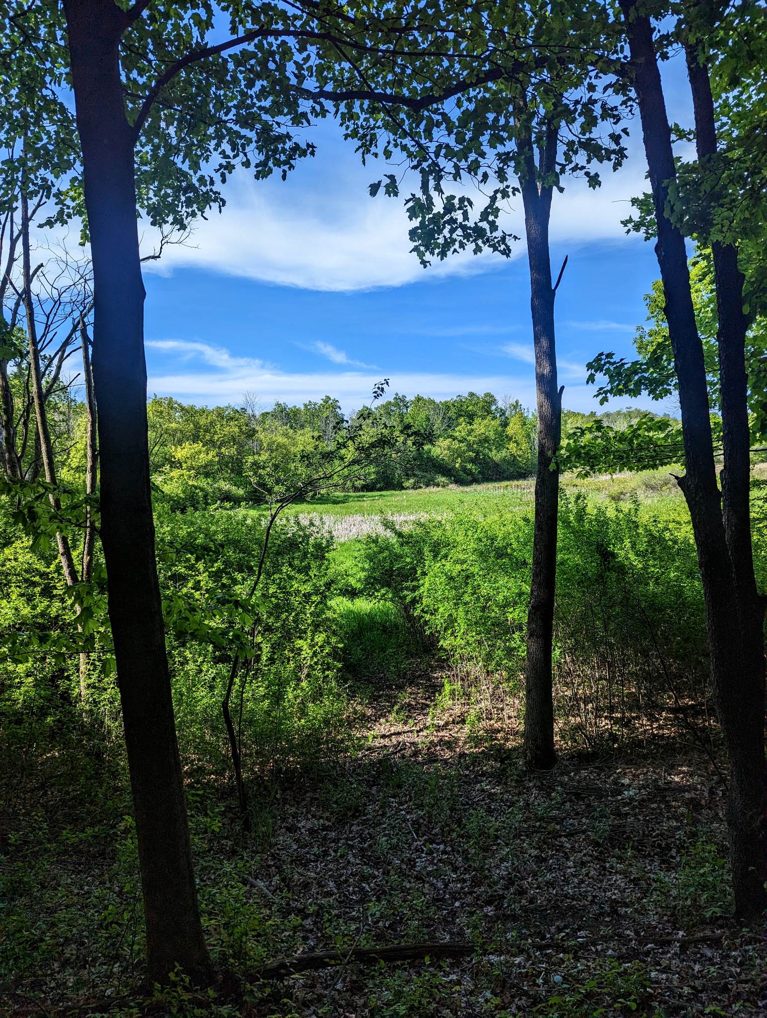 Even though this park is not too far from a busy shopping area and there are homes and apartments all around, we only saw two other people on the trail the whole time we were there! It was a warm, sunny Saturday afternoon in mid-May too, which usually brings everyone out on the trails. At first, when you enter from the main entrance on 35th, it feels a little underwhelming. You catch glimpses of the lake through the trees, but mostly you are just walking through dense woods. But as you reach the far side of the lake, things change. You wander off into the woods and get to see tons of different views! The lake becomes more visible, the understory changes, you start to cross little rock bridges over tiny streams, and eventually come to a beautiful prairie.
