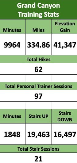 I kept really good records in my Excel spreadsheet of all my training for the Grand Canyon, and when I look at the numbers, they’re so impressive. There were 315 days in the year to train before my trip on November 11th. In that time, I specifically trained for 180 of those days…so for 57% of the year I made a conscious decision to get up and get moving according to the plan I made. And that doesn’t even include my pole dance classes, which were sometimes doubled up with personal training sessions (i.e trainer at 6am, pole class at 6pm the same day) but just as often they were not. Most weeks this year, I was actively working out 5-6 days a week.